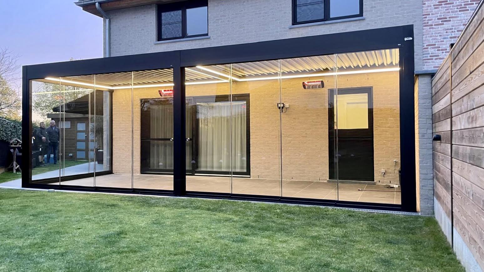Gekoppeld lamellendak V870 Arezzo voorzien van V768 vadella glazen schuifwanden en heaters - Ninove